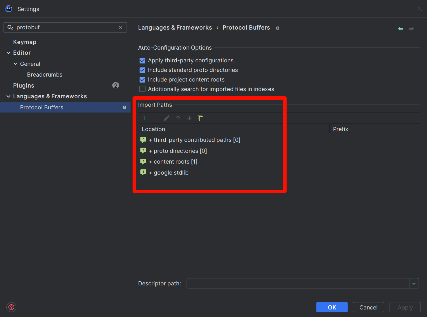 仅仅只是指定扫描路径是不够的,还需要指定生成路径以及目标protobuf