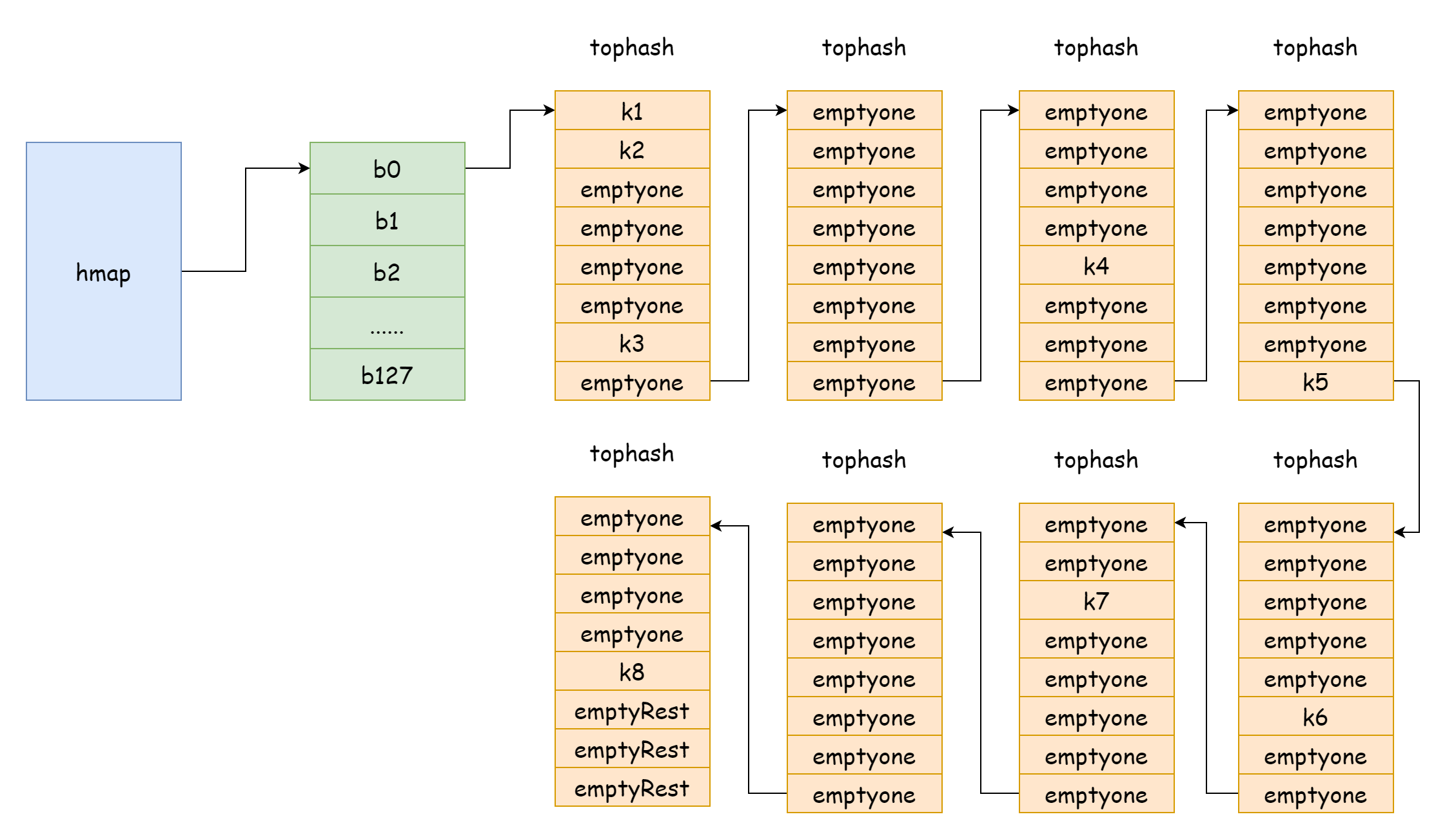,存放每一个键的高八位值,对于一个 tophash 的元素而言,有下面几种特殊的值const ( emptyRest = 0 // 当前元素是空的,并且该元素后面也没有可用的键值了 emptyOne = 1 // 当前元素是空的,但是该元素后面有可用的键值。 evacuatedX = 2 // 扩容时出现,只能出现在oldbuckets中,表示当前元素被搬迁到了新哈希桶数组的上半区 evacuatedY = 3 // 扩容时出现只能出现在oldbuckets中,表示当前元素被搬迁到了新哈希桶数组的下半区 evacuatedEmpty = 4 // 扩容时出现,元素本身就是空的,在搬迁时被标记 minTopHash = 5 // 对于一个正常的键值来说tophash的最小值 )