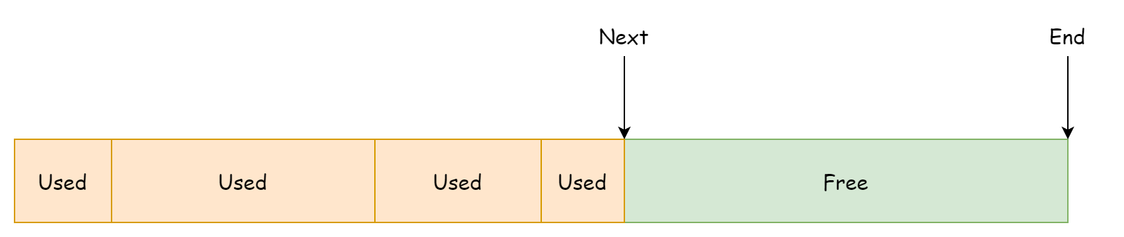 该分配器会向操作系统预先申请一片连续的内存空间,next
