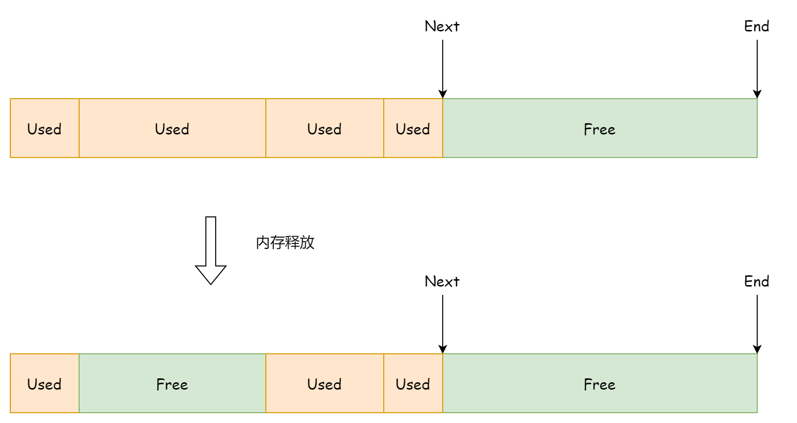 字段只会指向剩余的空间内存地址,对于先前已使用后被释放的内存空间则无法感知,这样做会造成很大的内存空间浪费,如下图所示。
