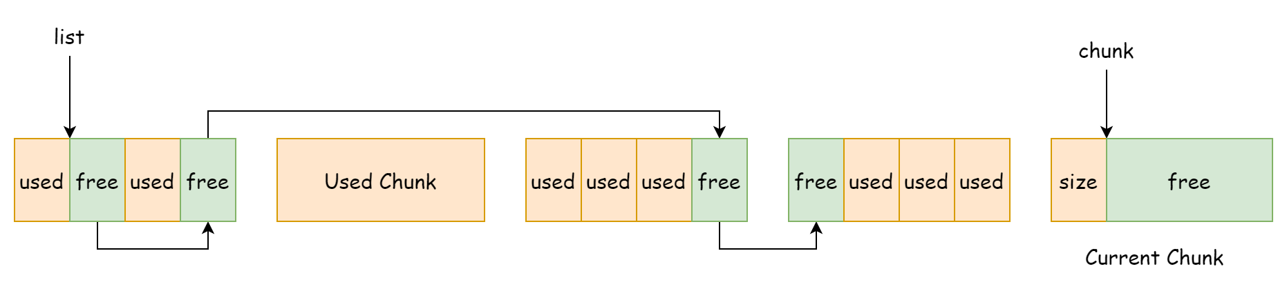 这种分配方式的优点就是快速和简单,缺点也相当明显,就是无法重新利用已释放的内存,因为next