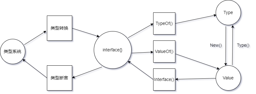 ,这也是为什么前面提到了只要有反射就离不开空接口。不严谨的说,空接口就是连接 Go 类型系统与反射的桥梁,下图很形象的描述了其过程。