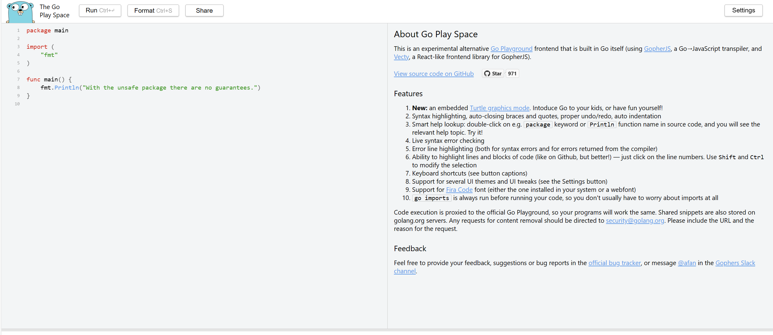 对于一些简单的单文件演示代码,go 提供了 playground 来在线运行 go 代码,不需要安装 go 环境,只需要一个浏览器即可。